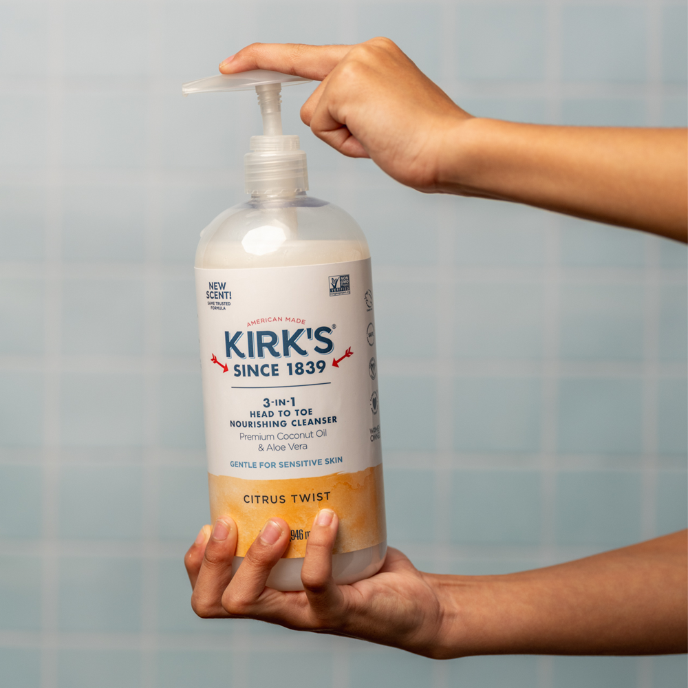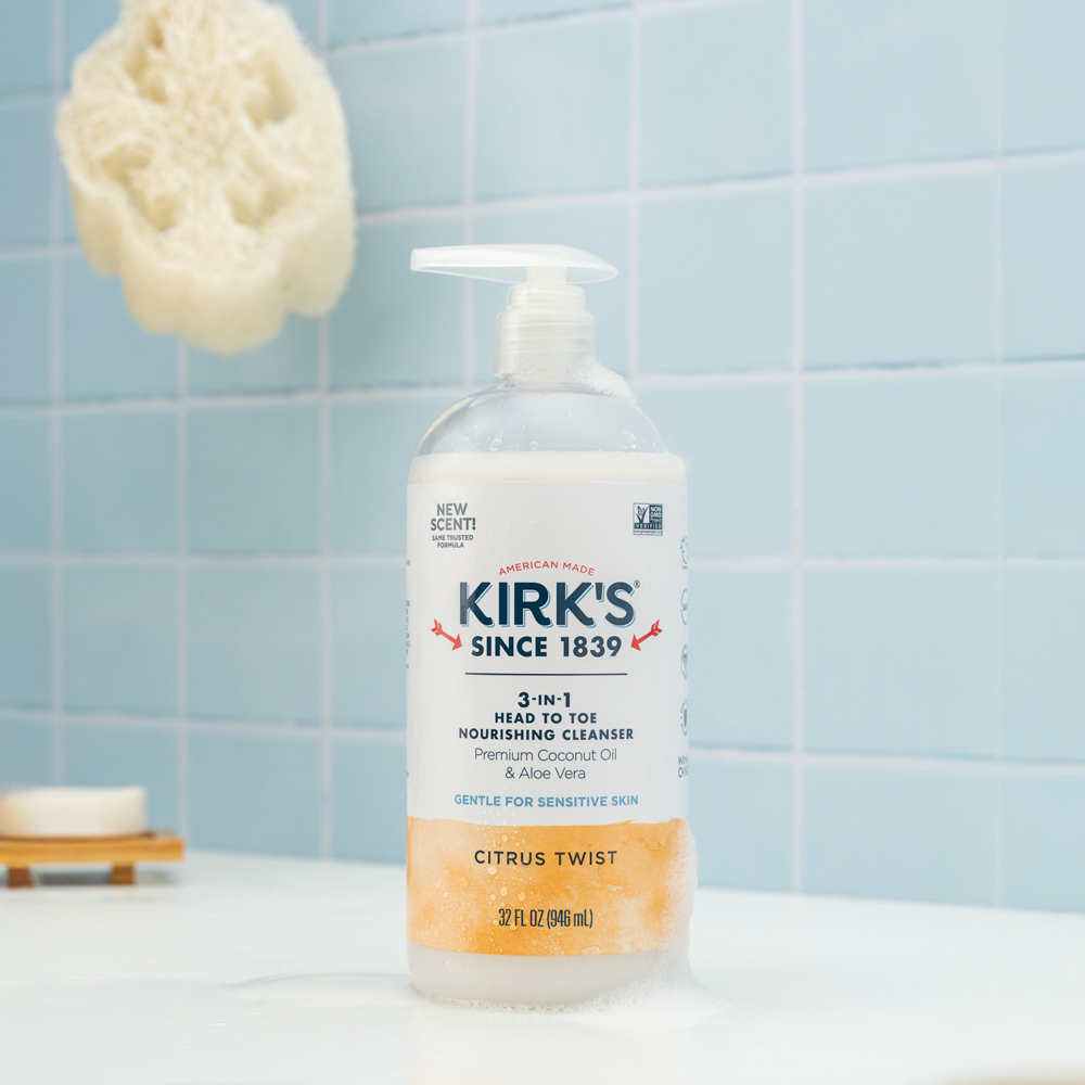 Enhanced with non-GMO Coconut Oil and soothing Aloe Vera. our 3-in-1 cleanser leaves you feeling soft and healthy – from head to toe. Kirk’s nourishing. multi-tasking cleanser simplifies your routine – in the shower. at the sink. and around the house!